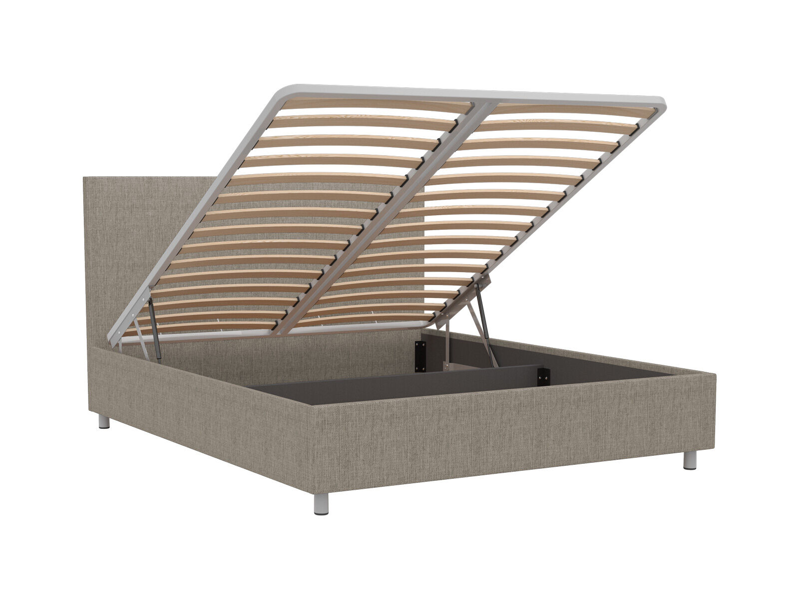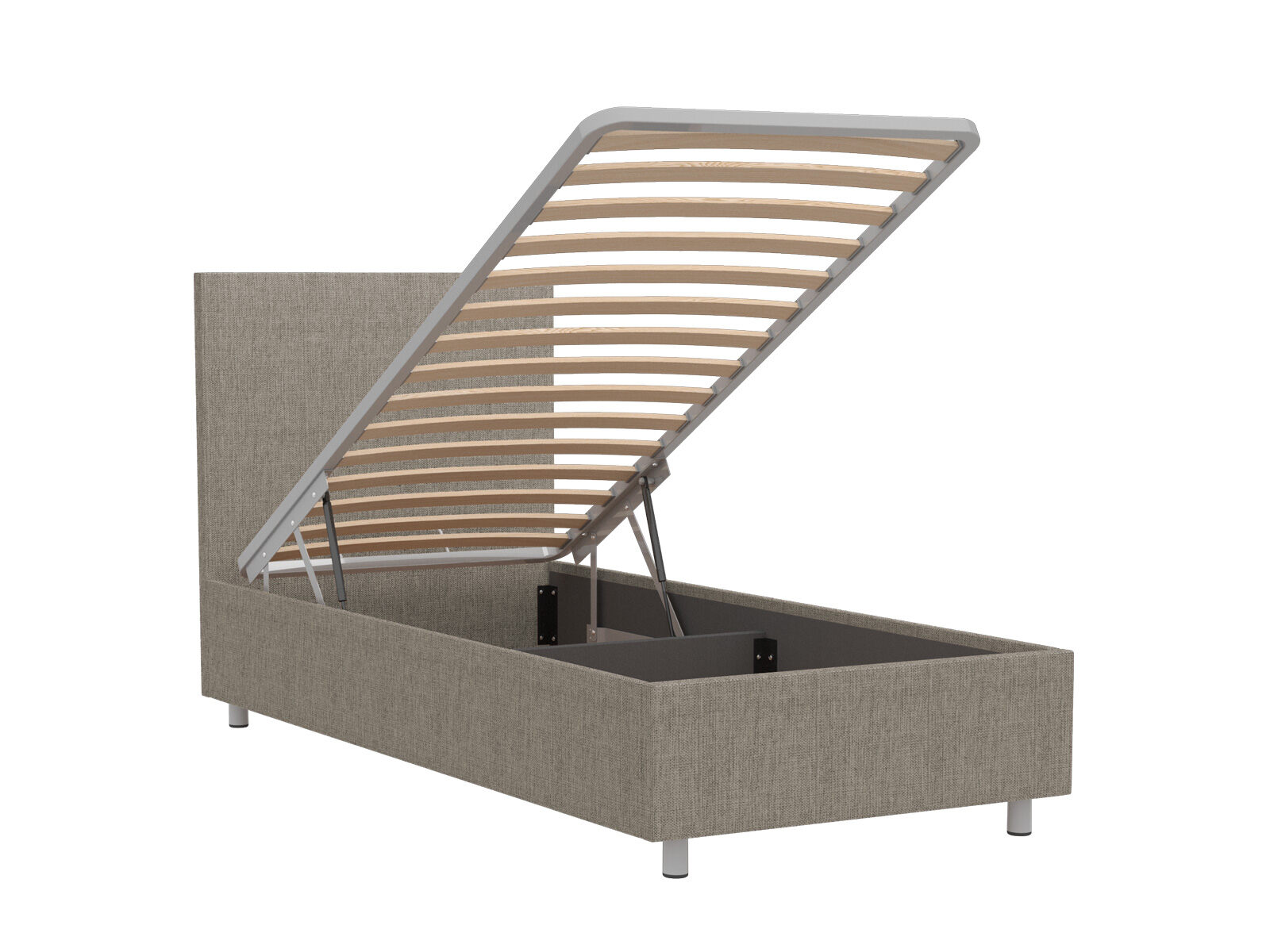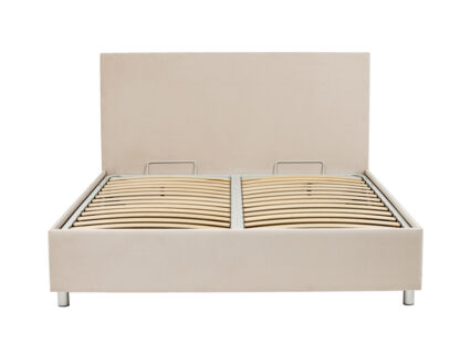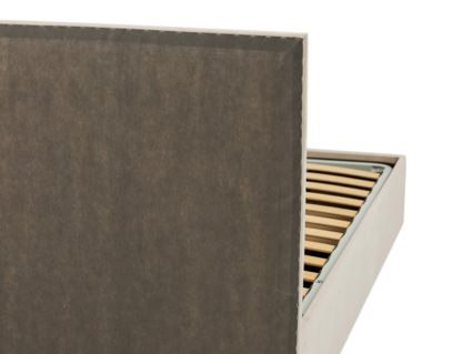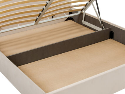 Кровать оснащена основанием с подъемным механизмом, под которым располагается бельевой ящик глубиной 16 см. Рекомендуемая высота матраса от 13 см, вес матраса до 50 кг. Чехлы на царгах несъемные. Высота/толщина царг: 28 см / 4 см (средняя), 2 см - (боковые).