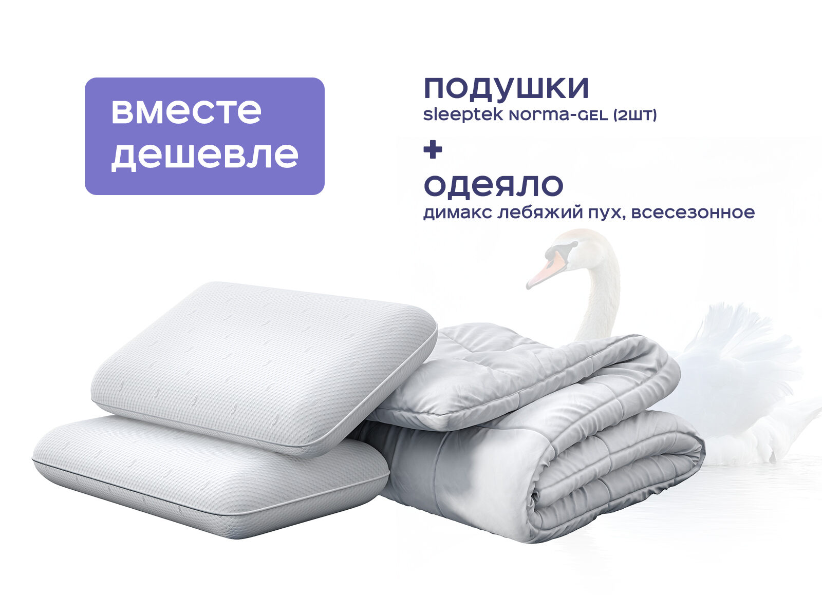 Комплект одеяло Димакс Лебяжий пух всесезонное + подушка Sleeptek Norma-GEL 2 шт. — это целая система для отдыха и релаксации. Лебяжий пух дарит дышащее тепло, подушки — охлаждение и поддержку. Вы получаете три продукта, которые работают как единый набор: одеяло регулирует температуру, подушки — поддерживают голову и позвоночник. А экономия до 40% — ваш бонус за умное решение. Идеальный сон — это не мечта, это выбор.
