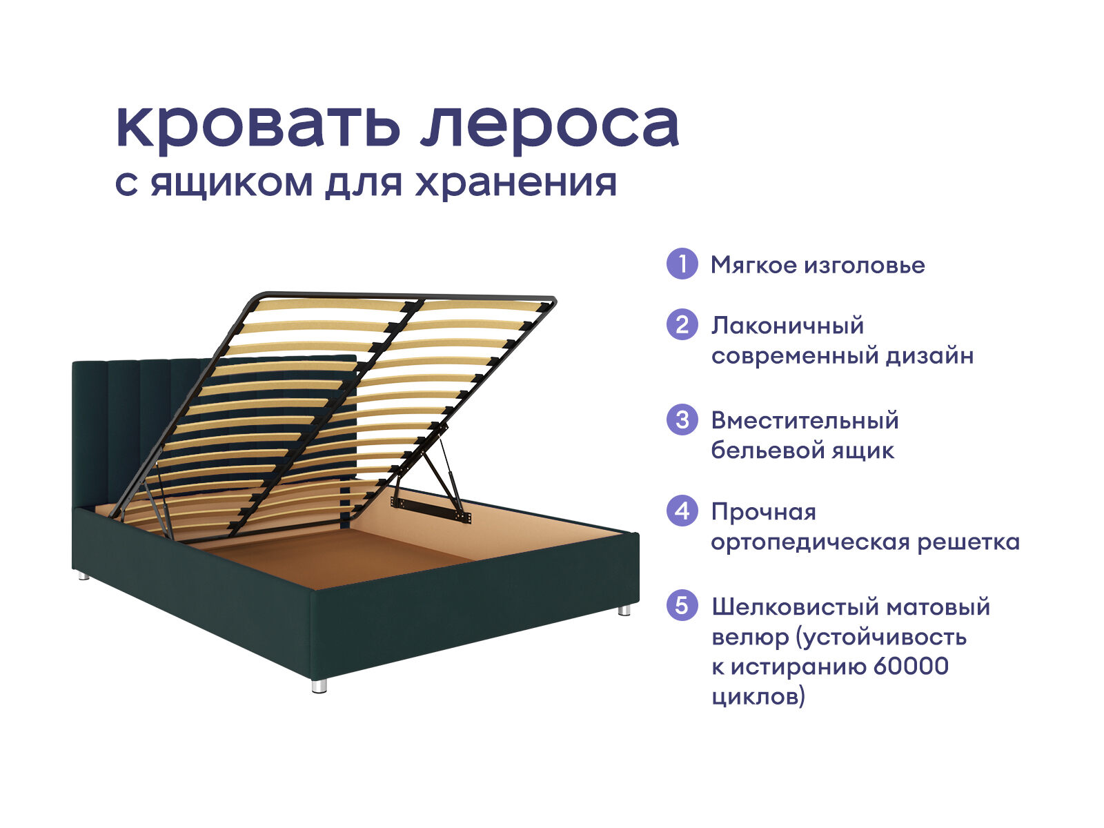 Модель отличается лаконичным изголовьем, которое украшает вертикальная параллельная стёжка. Стильная модель выделяется продуманным дизайном и украсит любой интерьер. Обивка кровати изготовлена из мягкого велюра. Мебельный короб производится из ДСП. В комплект входит ортопедическое металлическое разборное основание с подъемным механизмом.