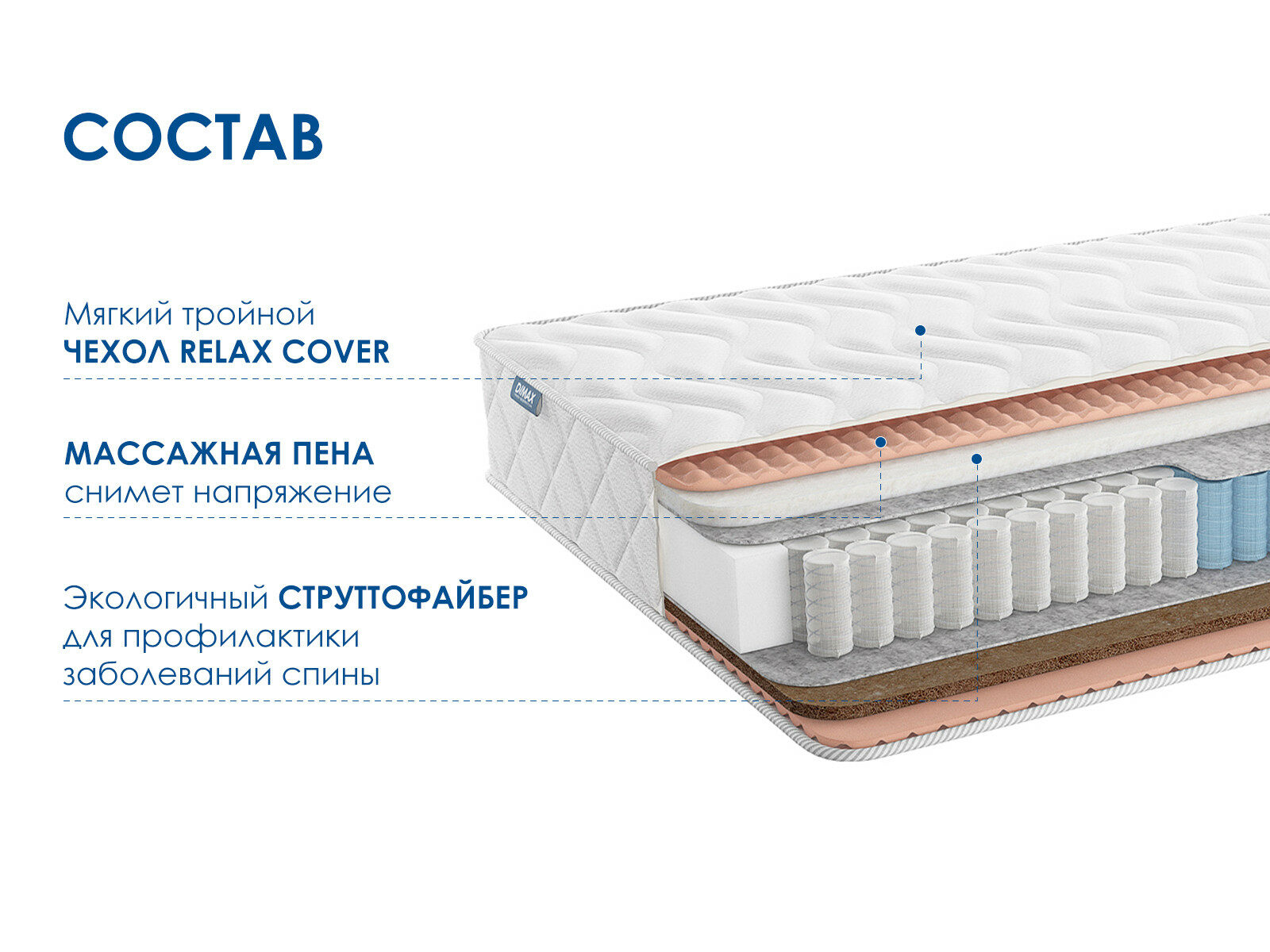 Димакс Relmas Solid 3Zone – ортопедический матрас с массажным эффектом, созданный для тех, кто предпочитает поддерживающие спальные поверхности с выраженной жесткостью. Разные уровни мягкости сторон позволяют выбрать оптимальный вариант комфорта, а зональный пружинный блок обеспечивает анатомически точную поддержку.