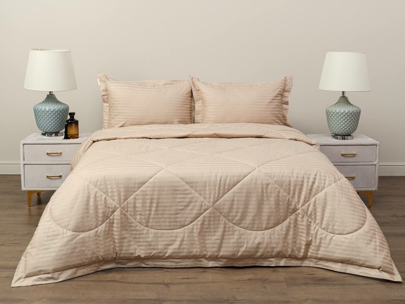 Одеяло очень удобно в использовании, легко стирается и быстро сохнет. Оно универсальное, средней толщины, что позволяет использовать его круглый год. К тому же, оно простегано элегантной стежкой, что не только придает красоты нашим комплектам, но и отлично фиксирует слой наполнителя внутри изделия.