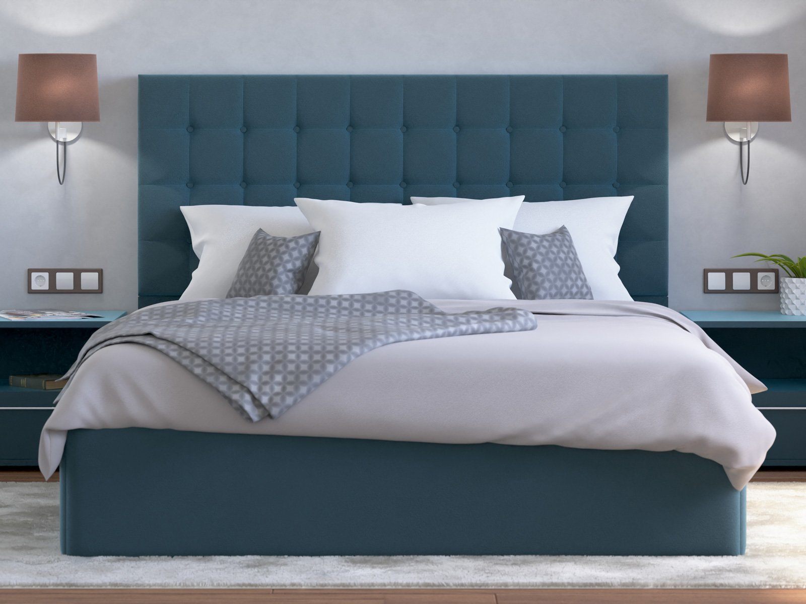 Мягкая кровать с обивкой из велюра.