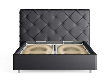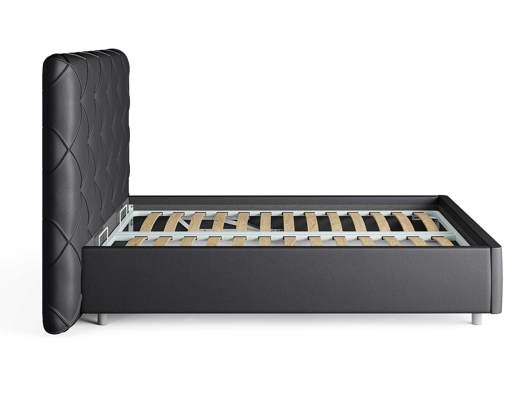 Современная интерьерная кровать. При необходимости, возможно установить подъемный механизм с бельевым ящиком. Ножная царга кровати скругленная по углам, что обеспечивает более элегантный внешний вид.