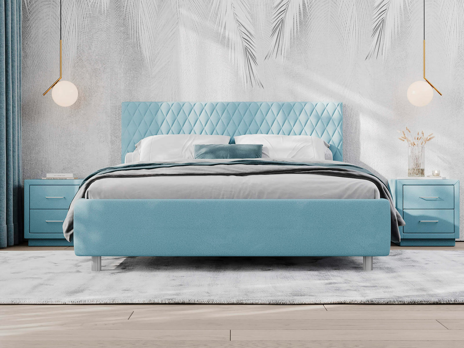 Прямую форму изголовья декорирует мягкий чехол. Чехол изголовья простеган ромбами среднего размера, что добавляет модели объем и подчеркивает выразительность. Кровать Stella лаконична, нейтральна, не берет на себя много внимания поэтому органично впишется в большинство современных интерьеров. Увеличенный просвет от пола позволяет облегчить уборку под кроватью, в том числе роботом–пылесосом. Царги кровати выполняются по технологии съемного чехла.