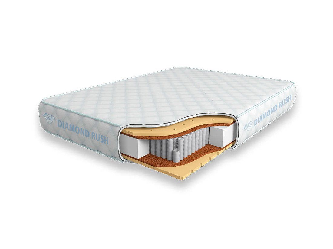 Матрас Diamond Rush Comfy-2 1440DR имеет в своей основе независимый пружинный блок 1440, состоящий из пружин диаметром 3-4 см. В качестве настилочных слоев поверх пружинного блока используются листы латексированной кокосовой койры, а также листовой перфорированный натуральный латекс. Стороны имеют одинаковую среднюю жесткость.