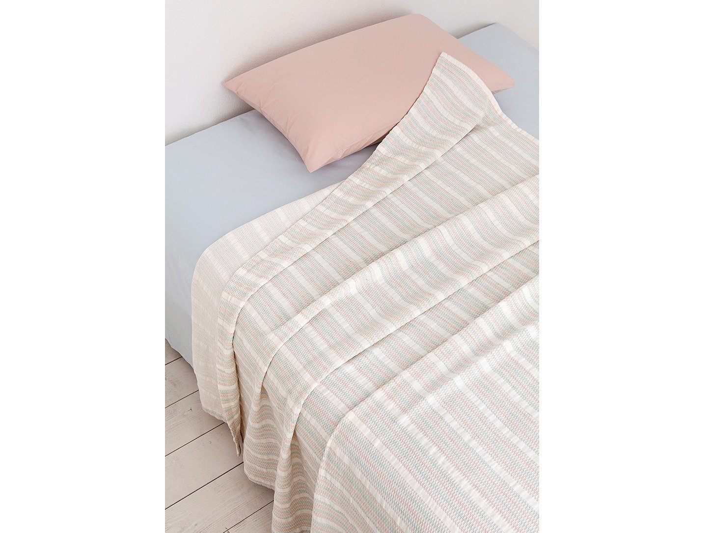 Легкое покрывало "CANDY" изготовлено из хлопковой рогожки. Этот натуральный материал имеет 'шахматный' рисунок нитей, обусловленный особенностями плетения. Покрывало прочное, износостойкое, обладает отчетливой фактурой. Сочетание трех цветов: экрю/розовый/голубой выглядит нежно и стильно. Покрывало упаковано в мешочек на завязках, поэтому его удобно взять с собой в поездку.