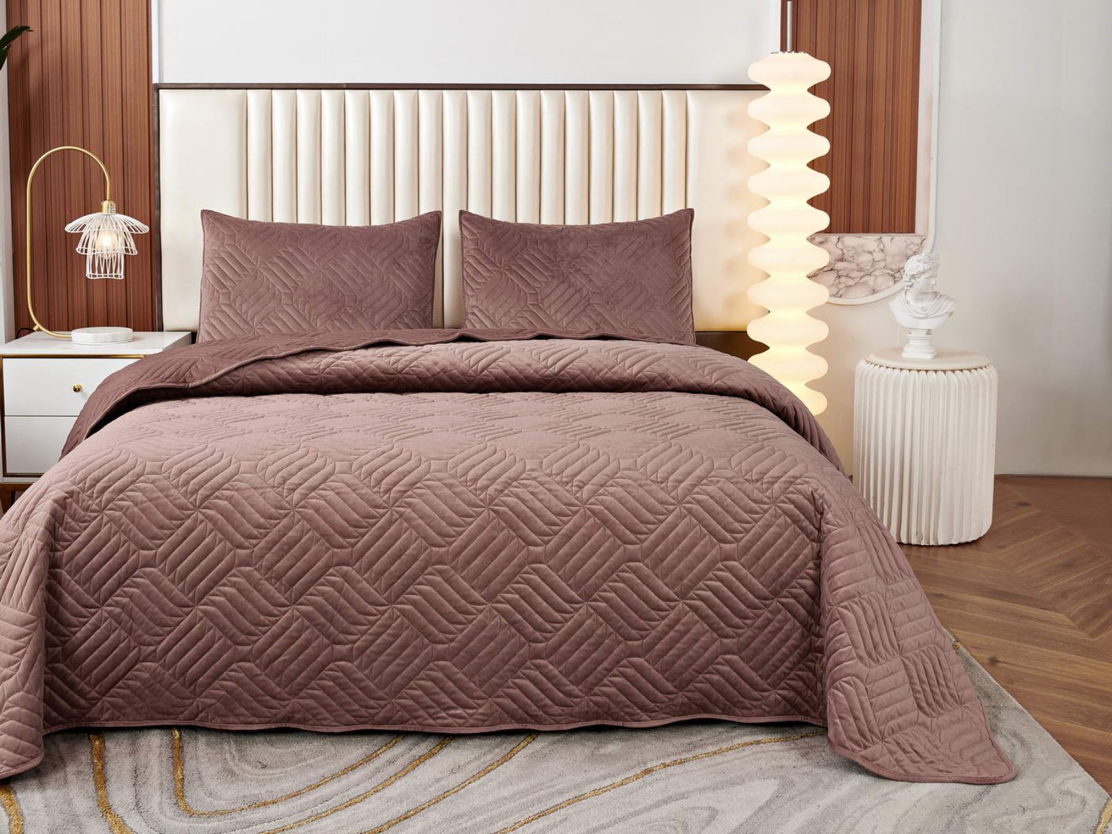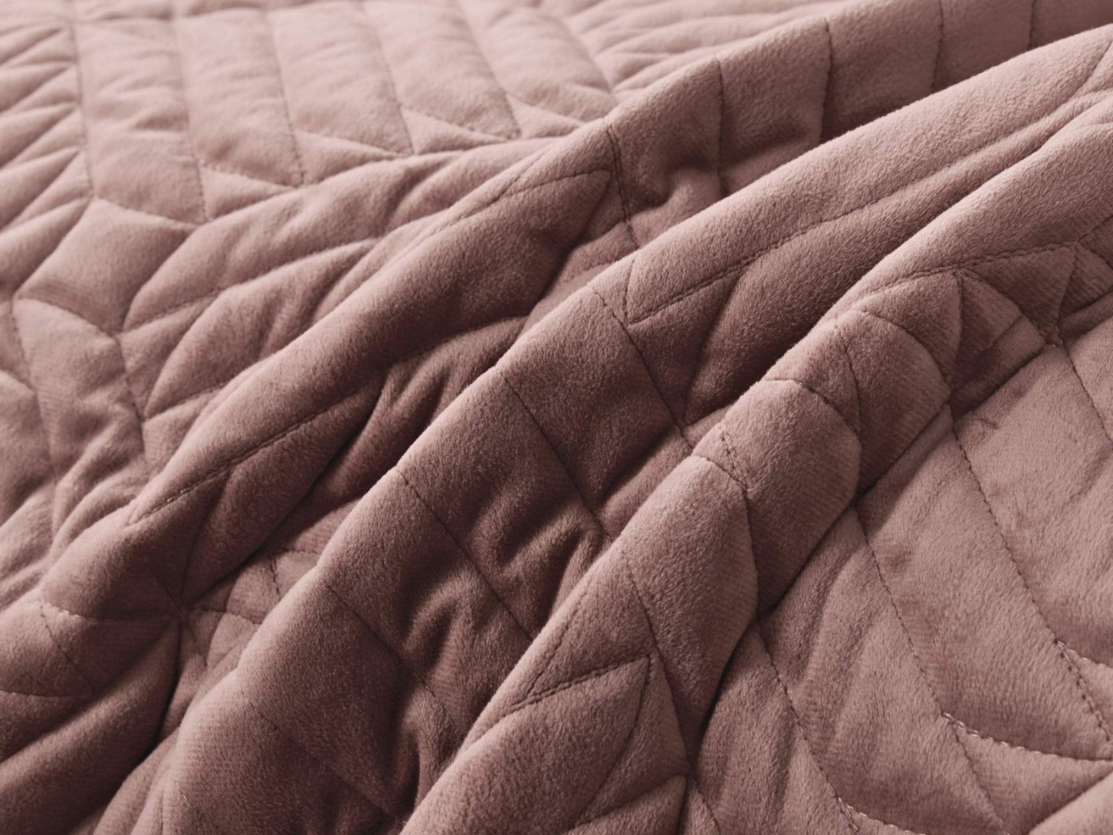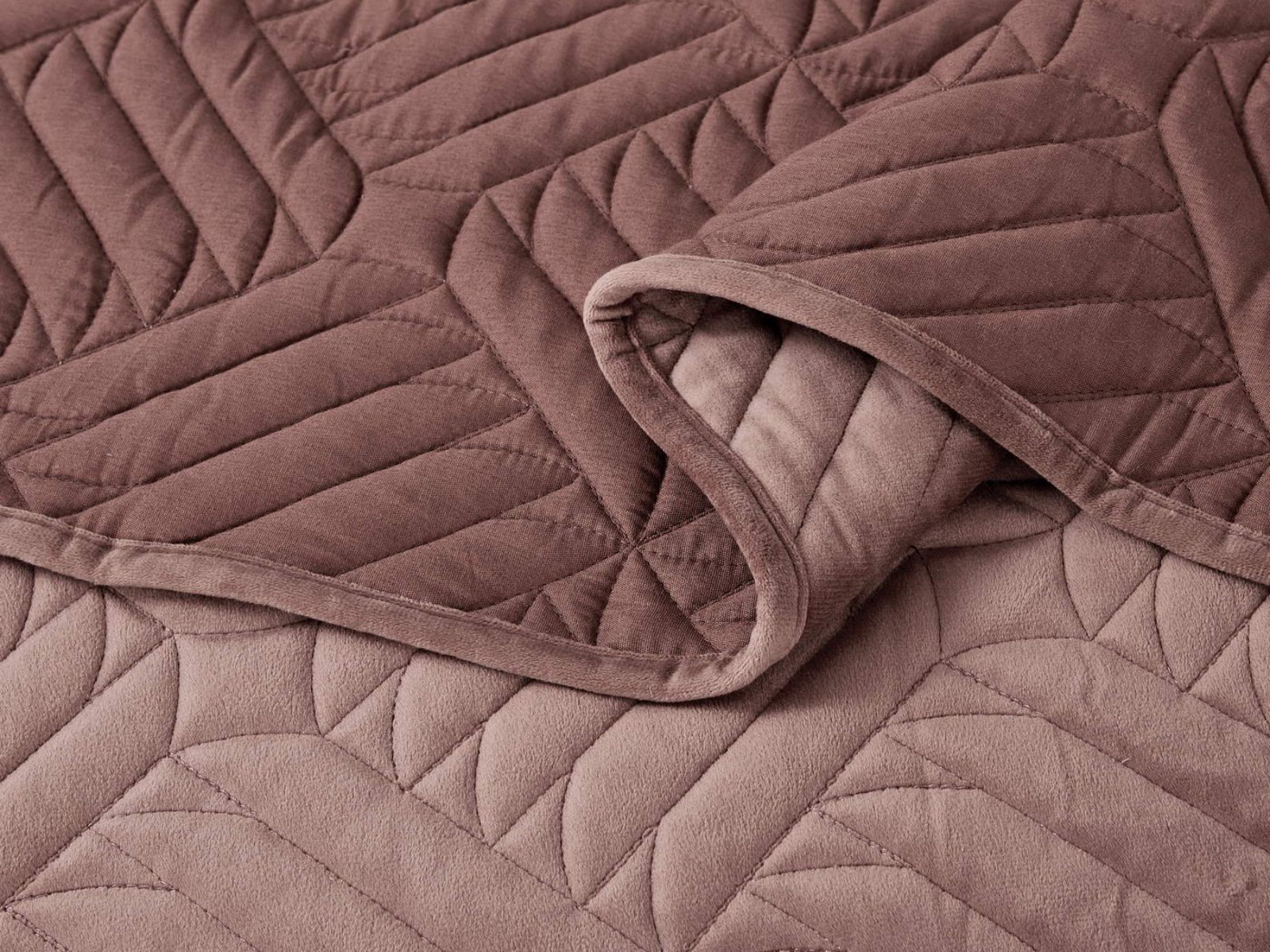 Покрывала выполнены в 10 оттенках: крем, мокко, пепельный, песочный, светло-бежевый, светло-серый, серый, темно-серый, чайная роза и черный. Стежка в виде геометрического орнамента подойдет к любому современному интерьеру. Из-за особого плетения, велюровая ткань покрывала отражает свет и красиво переливается при различном освещении.