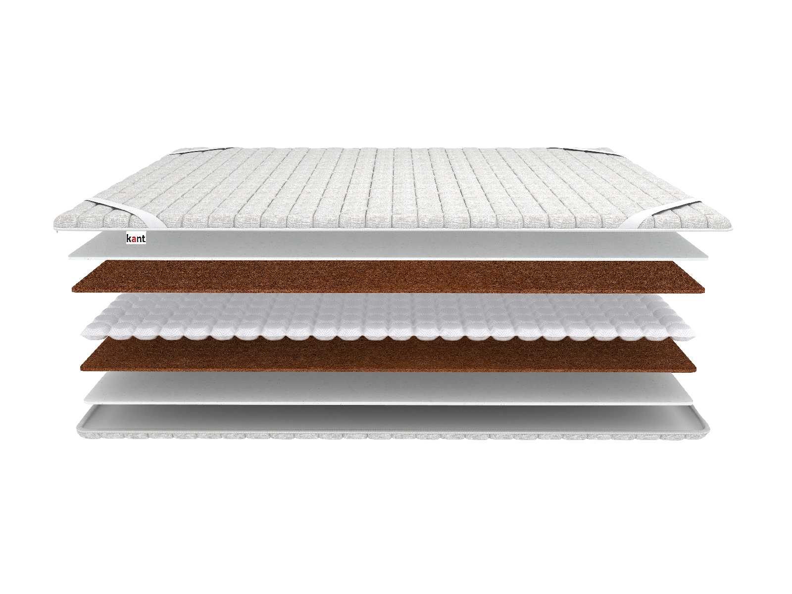 По сторонам от механизма зеркально установлены кокосовые полотна и слои ортопедической пены Kant Foam. Материалы великолепно дополняют друг друга и создают очень комфортную среду. Такой топпер отлично сгладит любые неровности за счёт плотной и жёсткой койры, а пена передаст поверхности анатомичными свойствами.